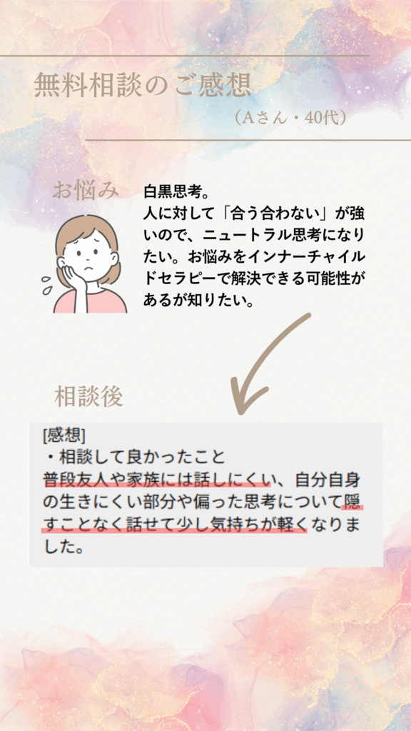 インナーチャイルドが自分を守るためにいてくれることが知れた点。とても深いお話が聞けました。