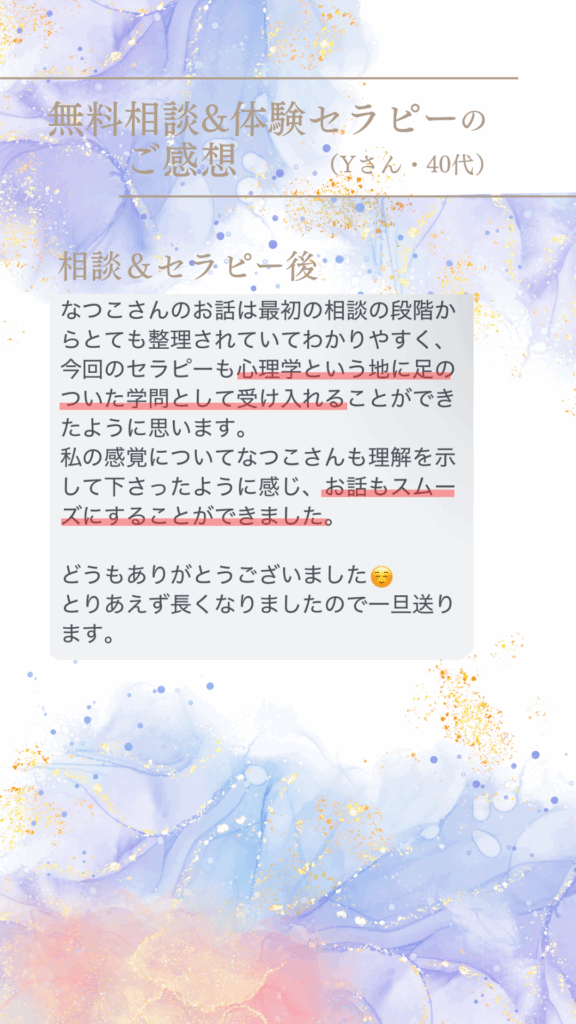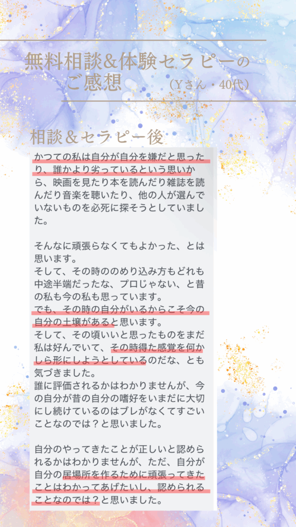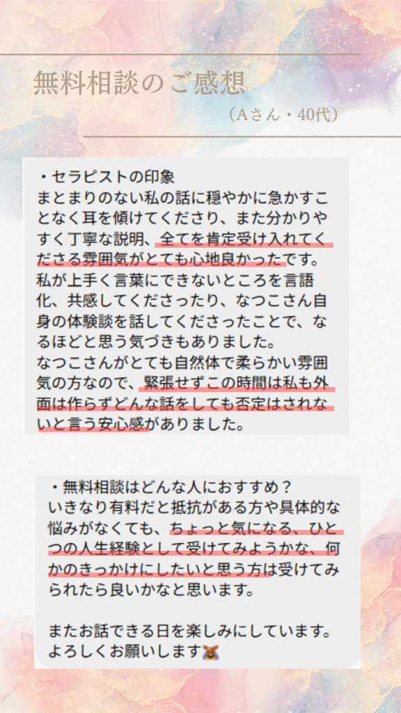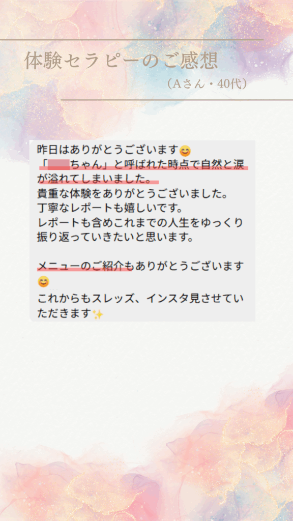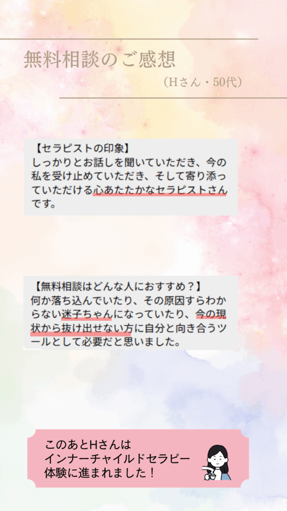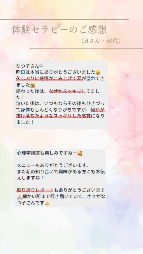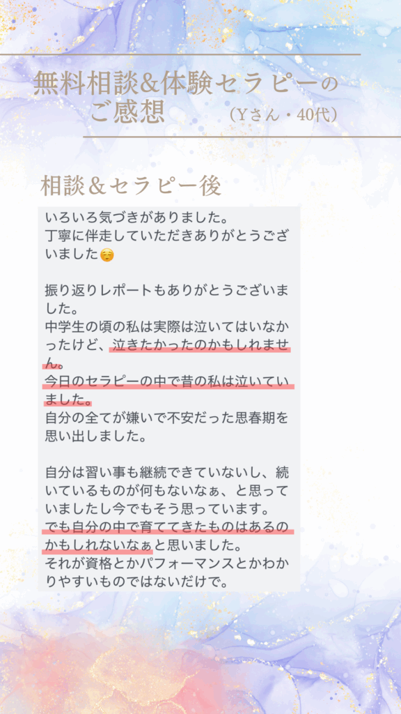 セラピストご自身の体験のお話の中で自分に通じる箇所があり、思わず涙して14歳の自分の気持ちが癒えた。