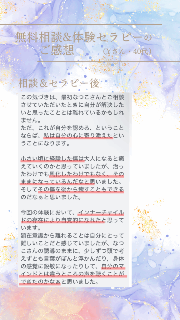 子供の頃のトラウマがあり、今も引きずってると自覚があるため、インナーチャイルドの癒しを受けて見たかったから。